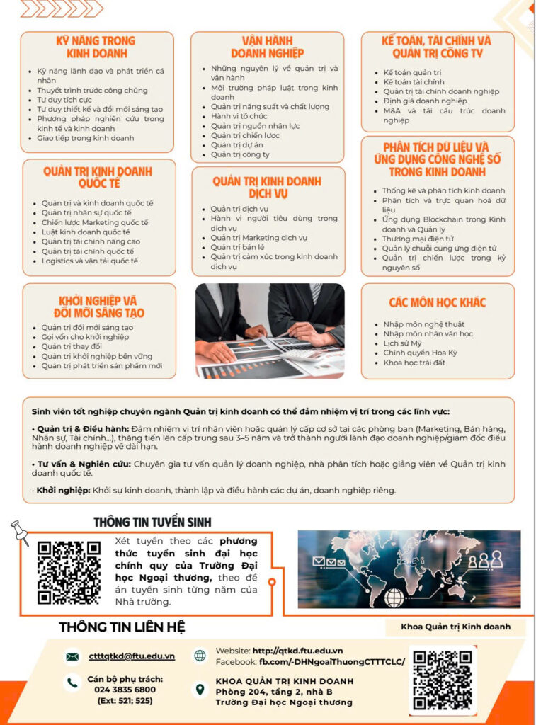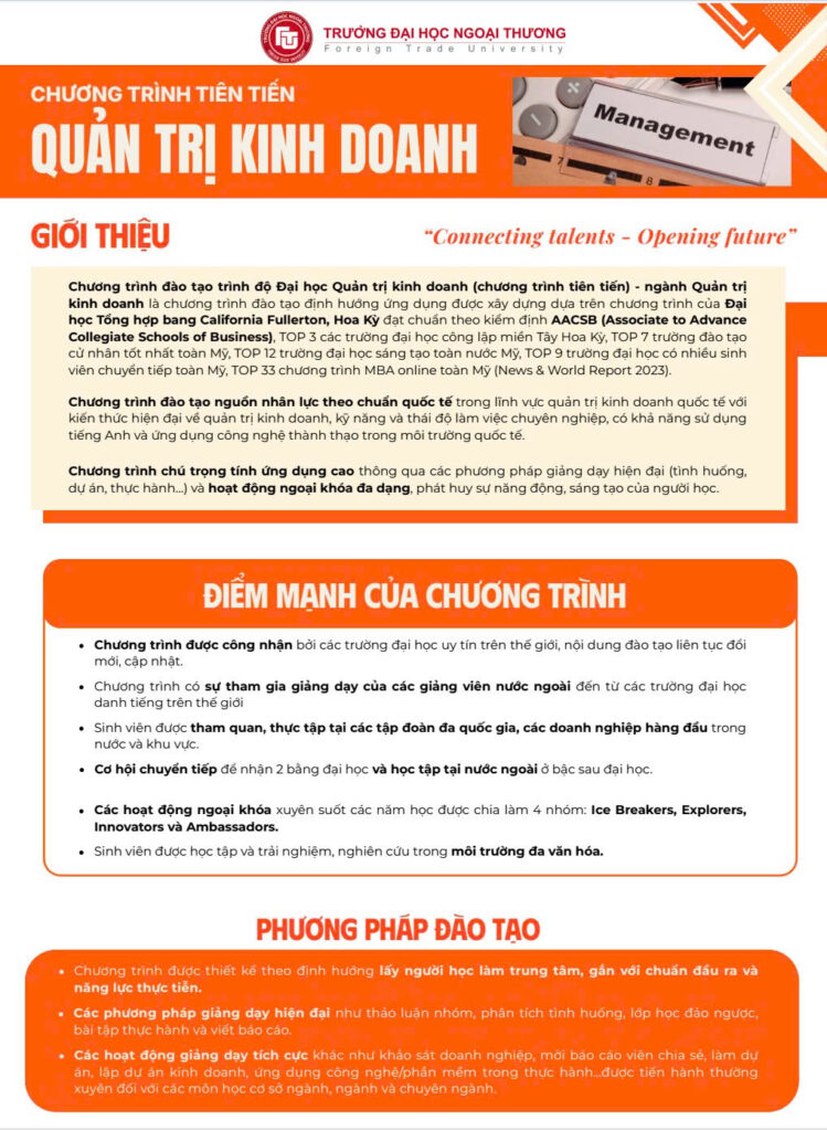 The Advanced Program in Business Administration at the Faculty of Business Administration, Foreign Trade University is an application oriented undergraduate program developed based on the curriculum of California State University Fullerton, United States, accredited by AACSB. The program is designed to meet international standards and to prepare students for the demands of a globalized and digitally driven economy.